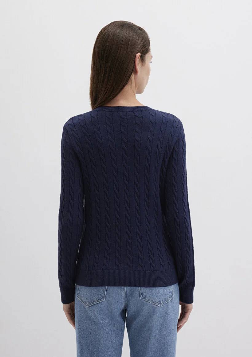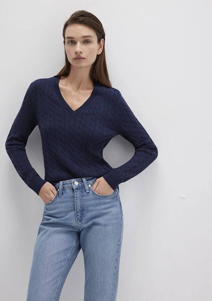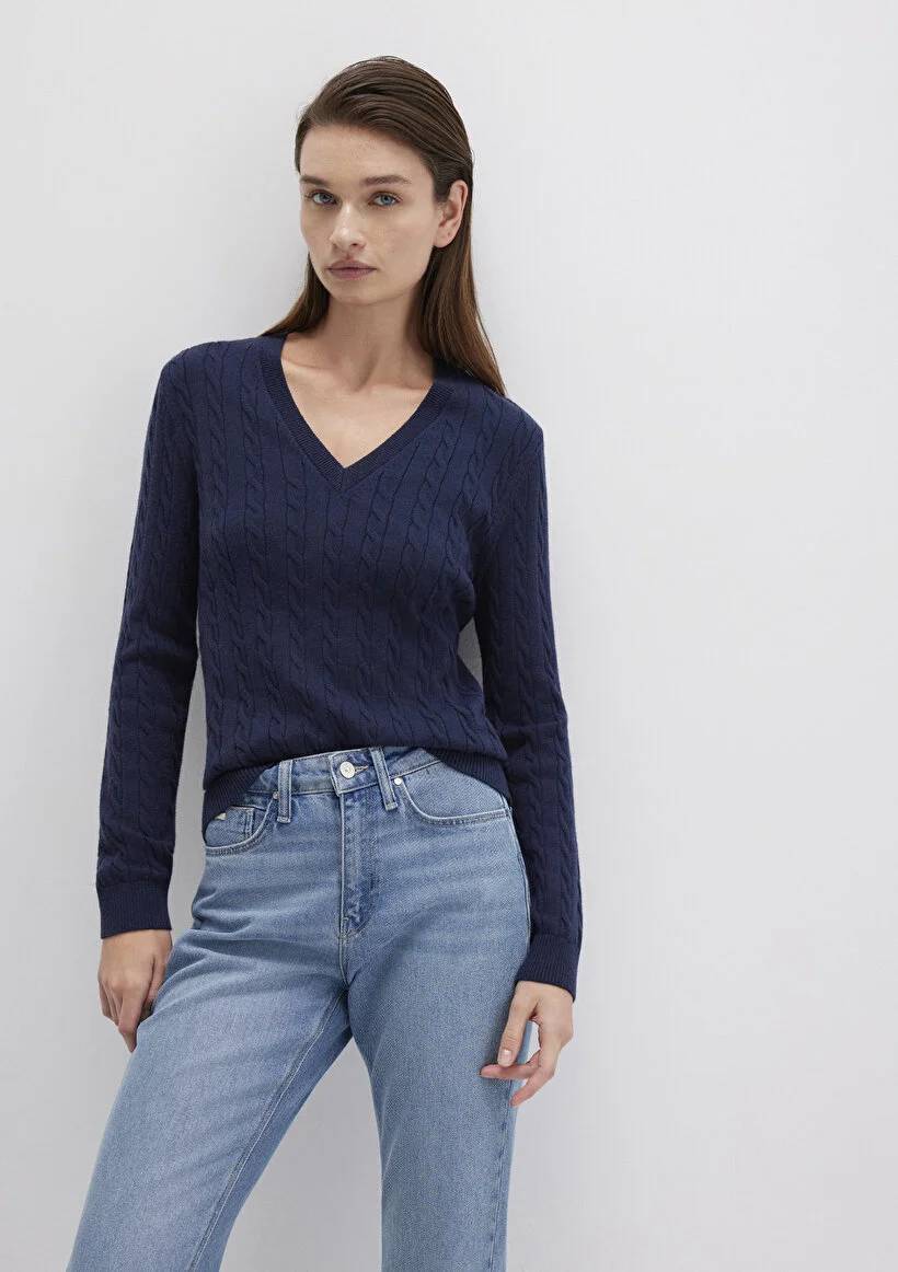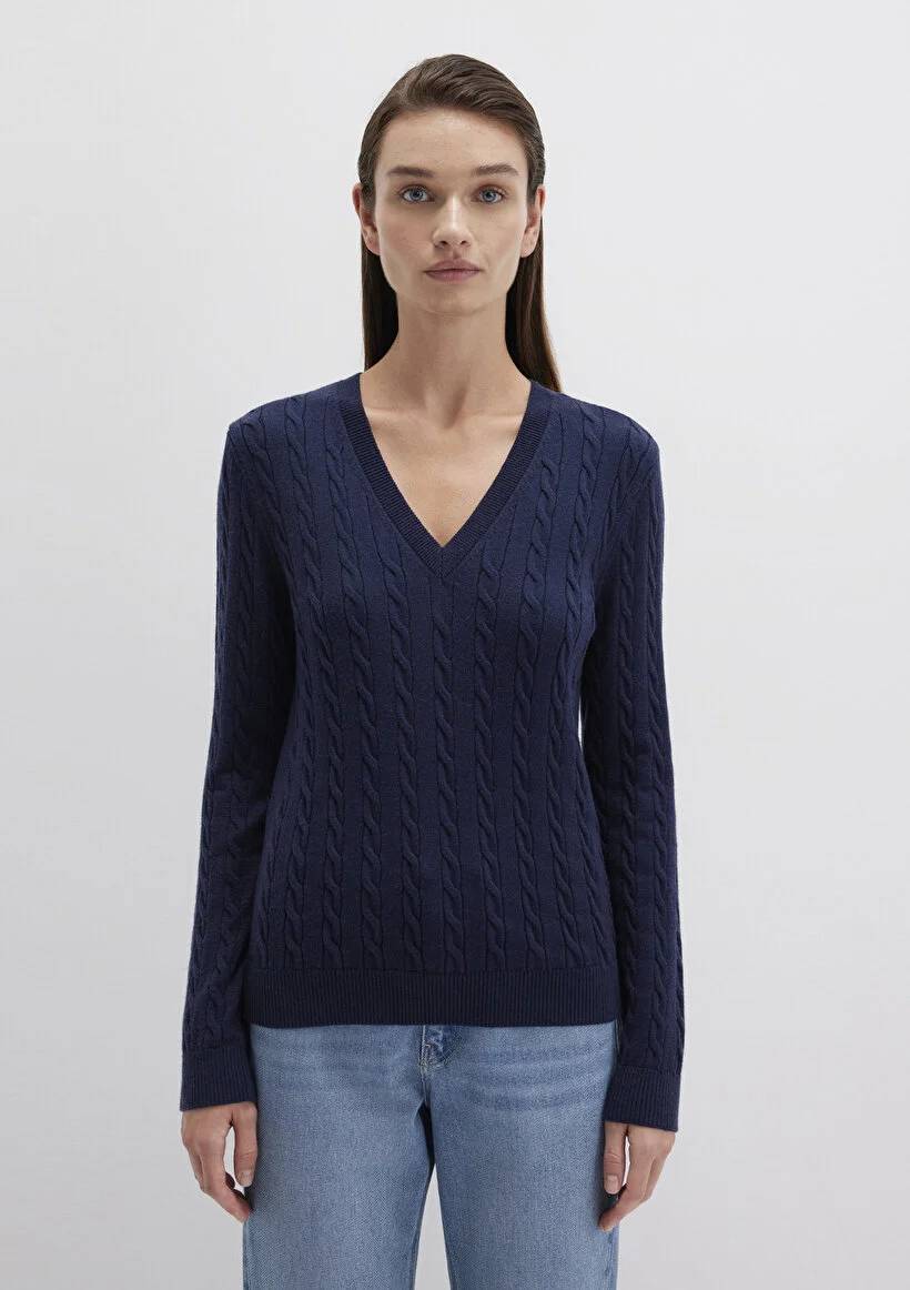 M1710340-84371 Mavi V Yaka Kadın Kazak