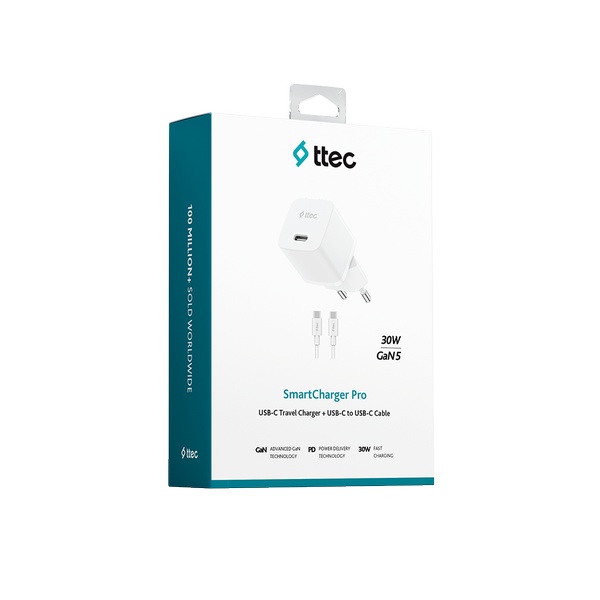• Ürün Adı : 2SCP03CB ttec SmartCharger GAN 30W PD Seyahat Hızlı Şarj Aleti + USB-C - USB-C 3A Kablo Beyaz